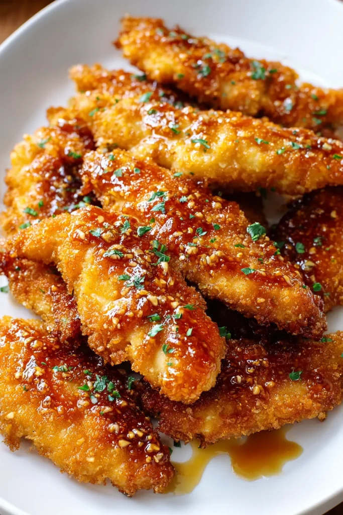 These chicken tenders are golden and crispy on the outside, juicy on the inside, enhanced by a rich honey butter garlic sauce that makes every bite exciting and savory.