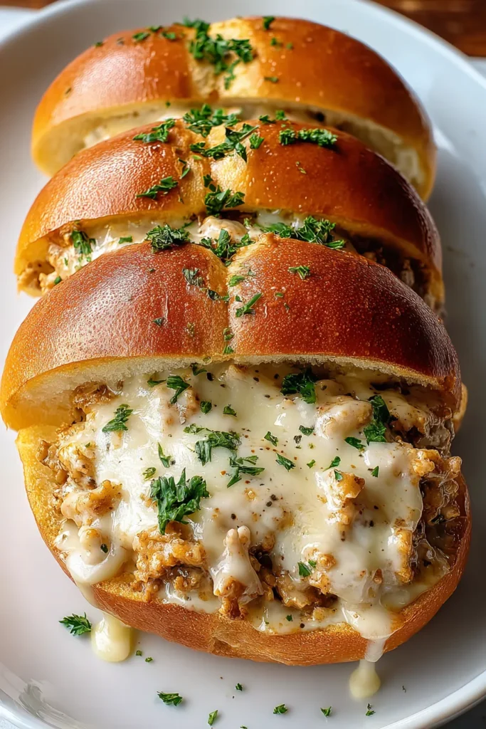 9. Spoon the creamy chicken Alfredo mixture onto the bottom halves of the buns, then top with the remaining halves.