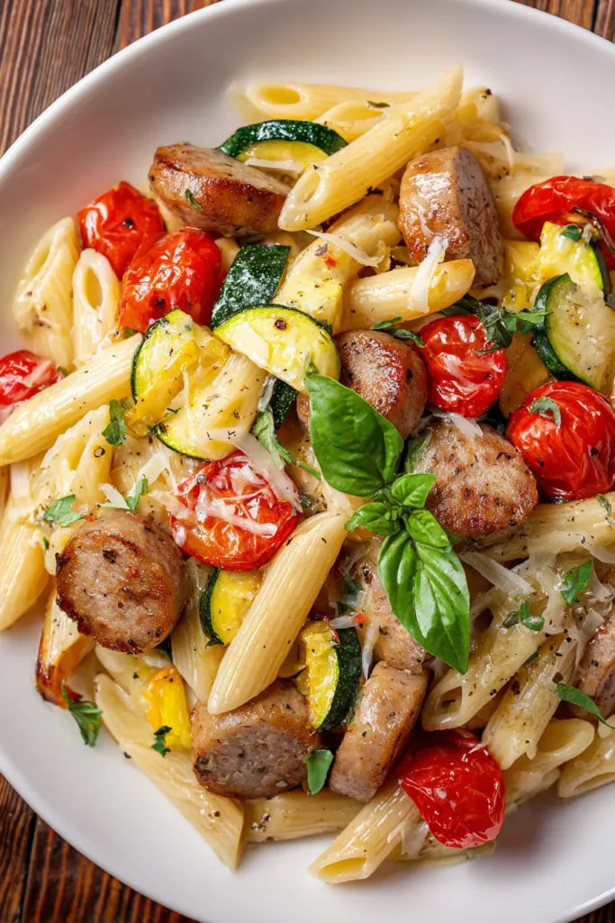 This Chicken Sausages with Zucchini, Tomatoes, and Pasta recipe brings together simplicity, speed, and sensational flavor in one colorful pan. From the moment you start cooking those chicken sausages in olive oil to the final swirl of Parmesan and basil, each step is designed to celebrate fresh ingredients without overcomplicating your kitchen time. Whether you’re looking for an easy weeknight dinner, a healthy meal that satisfies, or a crowd-pleasing lunch, this recipe checks every box. With just 15 minutes of prep and a total cooking time under 30 minutes, you’ll have a dish that looks gourmet but feels effortless—ideal for cooks of any skill level.