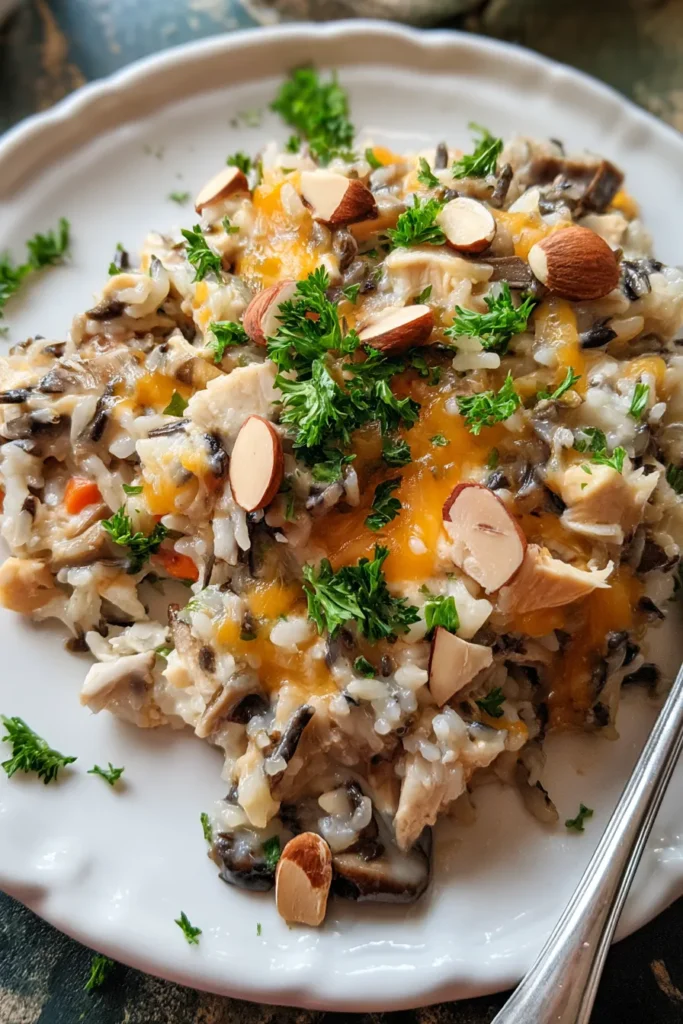 There you have it—a complete, cozy meal that brings together tender shredded chicken, nutty wild rice, fresh veggies, and a creamy mushroom sauce into one unforgettable casserole. From the buttery aromatics of onions and celery to the final sprinkle of crunchy almonds and bright parsley, each element plays its part in creating an irresistible weeknight dinner. This dish hits every note: it’s beginner-friendly with simple steps, it offers make-ahead convenience with freezer options, and it satisfies dinner-time hunger with its comforting, home-style flavors. You can print this article and save it for later use, knowing you have a go-to casserole that’s both versatile and delicious. Don’t forget, a handy FAQ section follows below if you’re curious about swaps, tips, or troubleshooting.