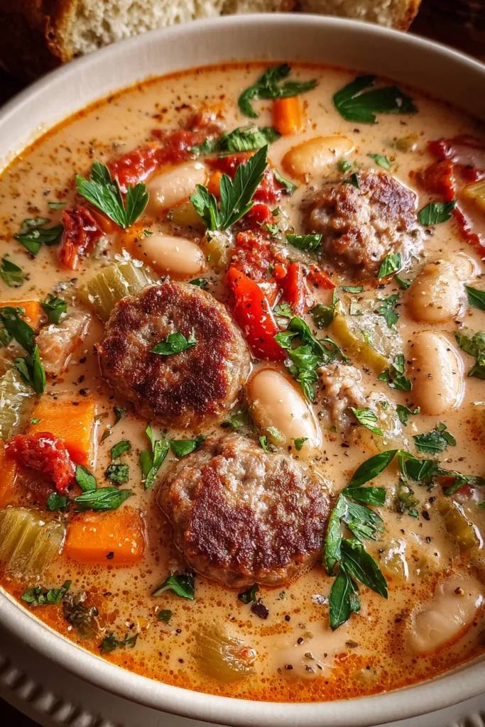 Experience the comforting blend of savory sausage, tender beans, and a touch of creamy richness in every spoonful of this satisfying soup.