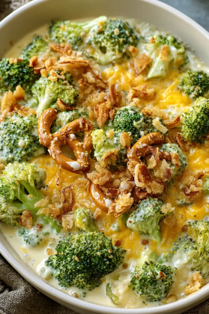 This creamy broccoli cheddar casserole combines tender broccoli with rich cheese sauce and is topped with irresistible garlic butter pretzels for a delightful crunch.