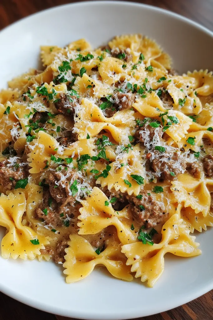 What makes this recipe truly special isn’t just the combination of flavors, but the ease with which it comes together. In under 40 minutes from start to finish, you can transform simple pantry staples into a show-stopping dish worthy of any dinner table. The first forkful greets you with savory beef crumbles, followed by the lush, creamy sauce that clings to each bowtie pasta. And let’s not forget that garlicky kick—just enough to linger on your taste buds without overpowering the rest of the flavors. This is the kind of meal you’ll want to revisit again and again, tweaking it with a sprinkle of red pepper flakes or swapping in ground turkey for a lighter twist.