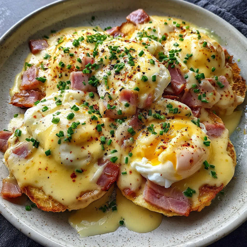 Soft toasted muffin quarters nestle beneath a creamy custard of eggs and cream, scattered with browned Canadian bacon and cheddar. Baked until golden, each slice is finished with fresh chives and a velvety hollandaise drizzle.