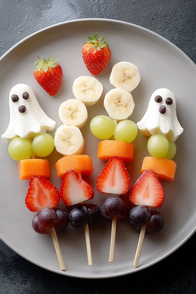 These playful ghost fruit skewers combine fresh bananas, grapes, strawberries, and cantaloupe for a healthy and festive Halloween treat that's fun for kids and adults alike.