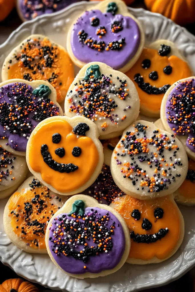 Arrange a mix of orange, purple, and black cookies on a decorative platter. Garnish with mini pumpkins, faux cobwebs, or autumn leaves for a centerpiece that matches your Halloween décor.