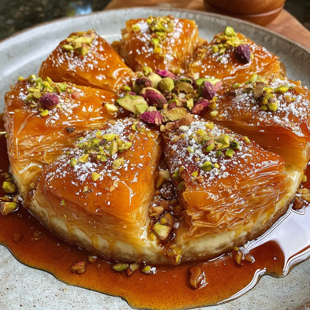 Crisp layers of buttered phyllo cradle a spiced walnut and pistachio filling, then get crowned with a smooth, tangy cheesecake layer. Warm honey seeps into every crevice, while a dusting of powdered sugar adds a sweet finish.
