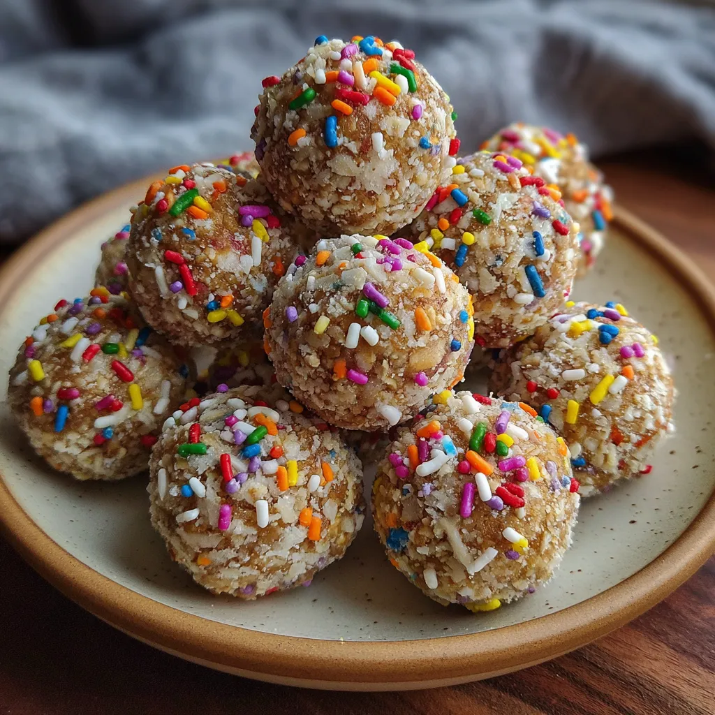 These vibrant protein bites blend creamy almond butter, vanilla powder, and rainbow sprinkles into soft, chewy spheres. A sweet, satisfying no-bake snack that fuels your day with a burst of cake-like flavor.