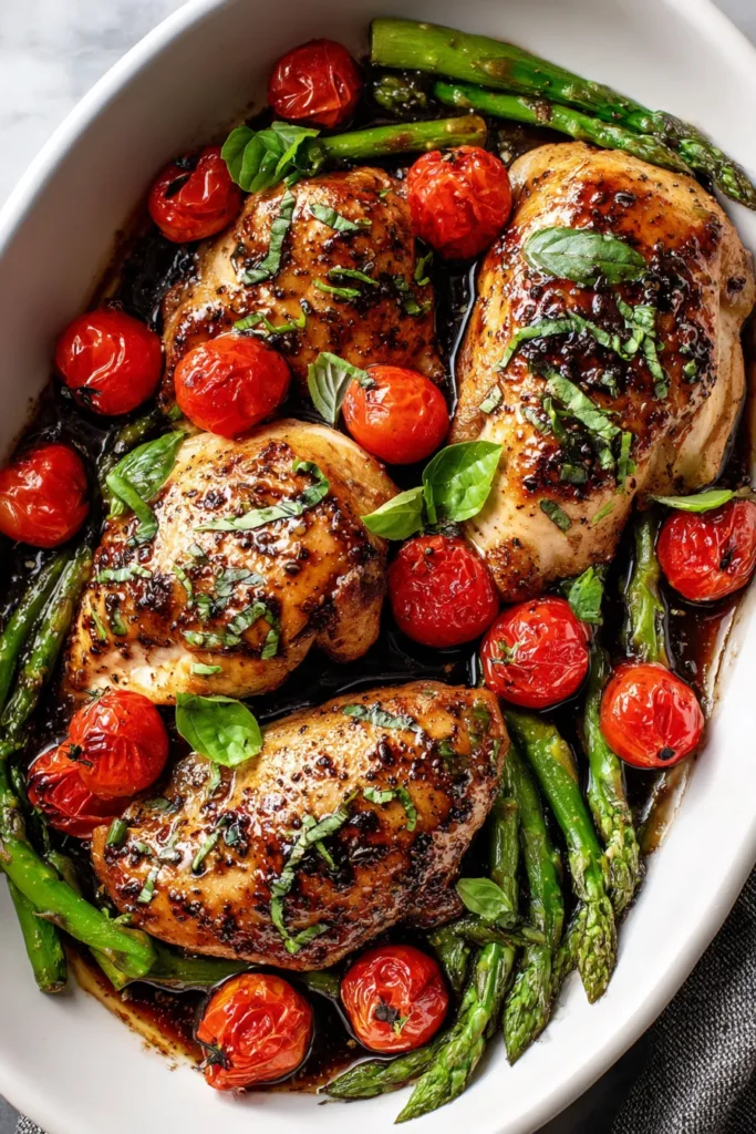 Succulent chicken breasts seared to perfection, paired with vibrant cherry tomatoes and asparagus, all enveloped in a tangy balsamic glaze. A one-pan wonder that's healthy and bursting with flavor!
