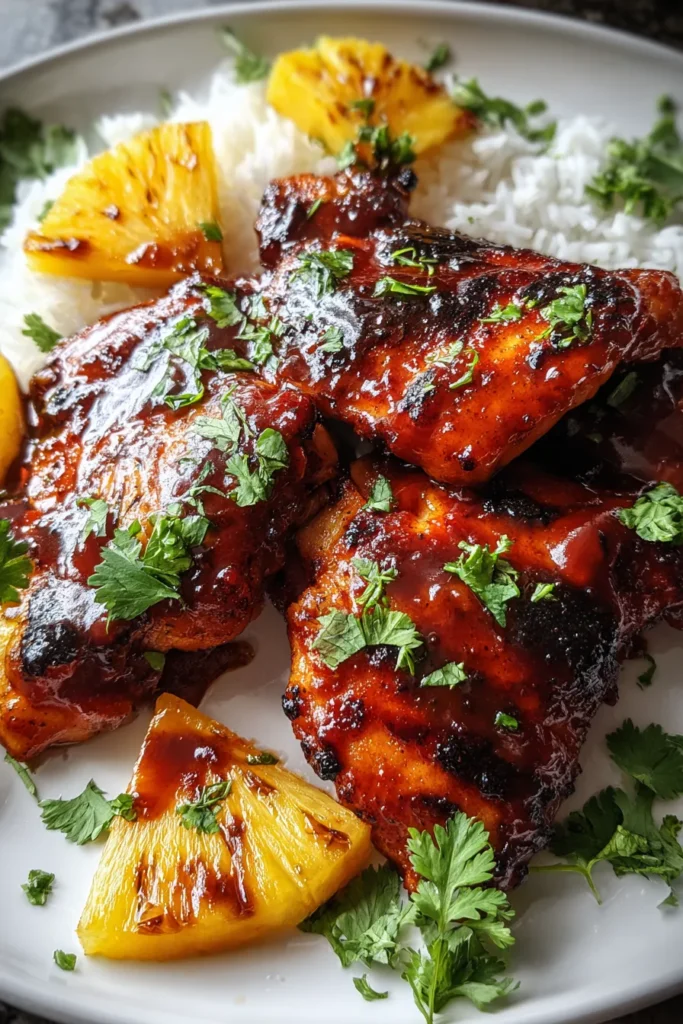 8. Serve the Pineapple BBQ Chicken hot, garnished with chopped cilantro and grilled pineapple slices if desired, for a finishing pop of color and fresh flavor.