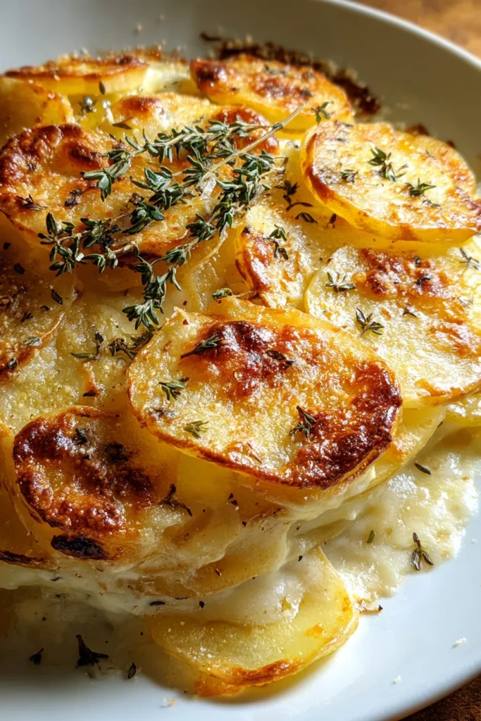 Growing up, every family gathering seemed incomplete until that first forkful of potatoes au gratin rolled across my plate. The way the cheeses blend into a silky layer around each slice evoked childhood memories of warmth and laughter echoing in the kitchen. I’ve since fine-tuned the ratio of Gruyère to Parmesan to hit that perfect point—nutty, salty, and just a little tangy, balancing the gentle bite of freshly ground black pepper. Nothing beats that moment when you pierce the golden top with a spoon and get a peek at the creamy goodness hiding underneath. I love sharing this recipe with friends, inviting them to taste how roasting a simple head of garlic can transform its flavor into something sweet and caramelized. For an extra touch, I sometimes sprinkle a hint of nutmeg into the cream mixture, which adds a subtle warmth that dances on the palate. And if you’re feeling playful, a handful of golden breadcrumbs mixed with melted butter gives the gratin a satisfyingly crunchy finish. Trust me—once you pull this dish from the oven, you’ll want to savor every cheesy, garlicky bite and keep people coming back for seconds.