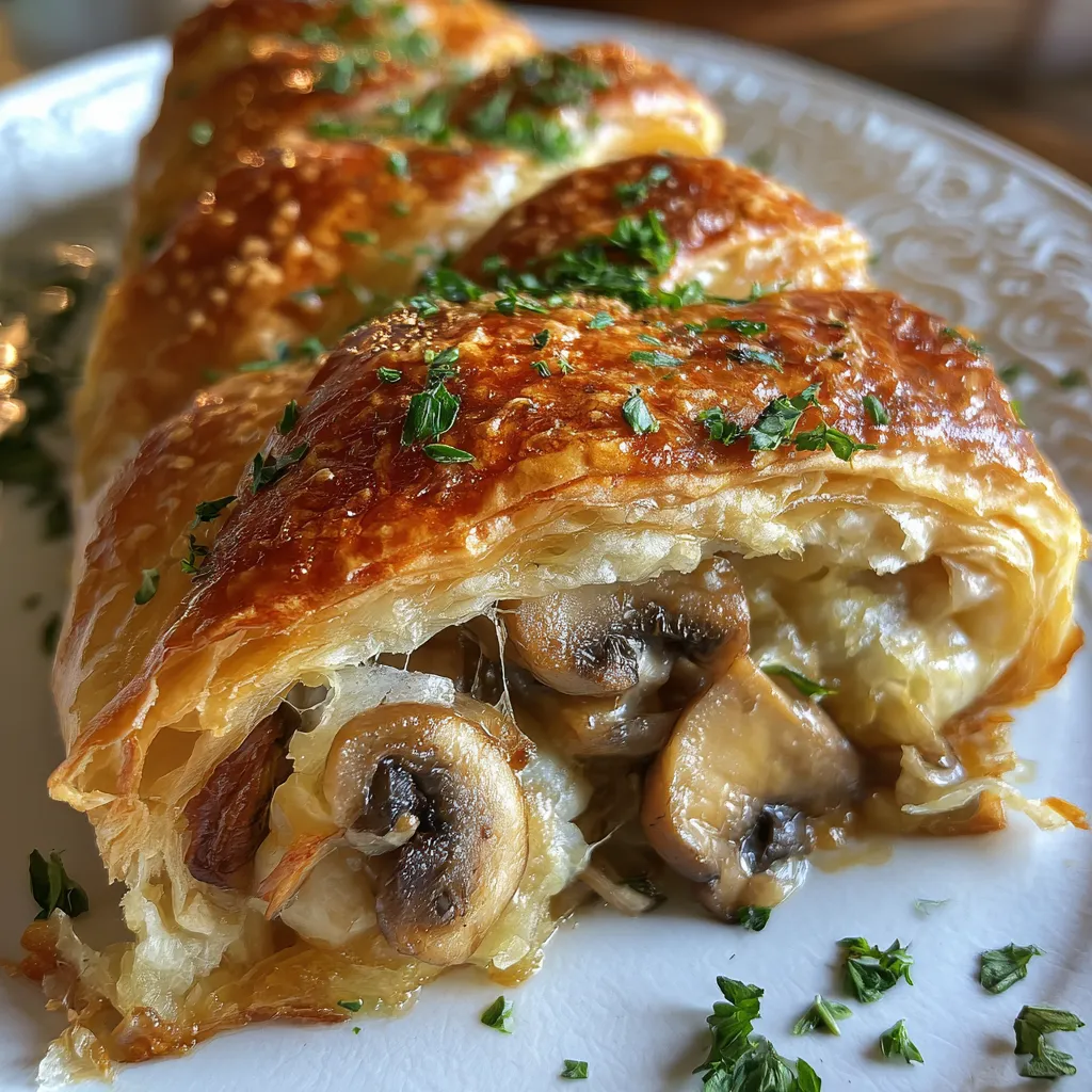 Flaky buttery pastry weaves around savory sautéed mushrooms infused with garlic and thyme, melting together with nutty Gruyère. Each golden slice reveals warm, gooey cheese and a hint of fresh parsley.