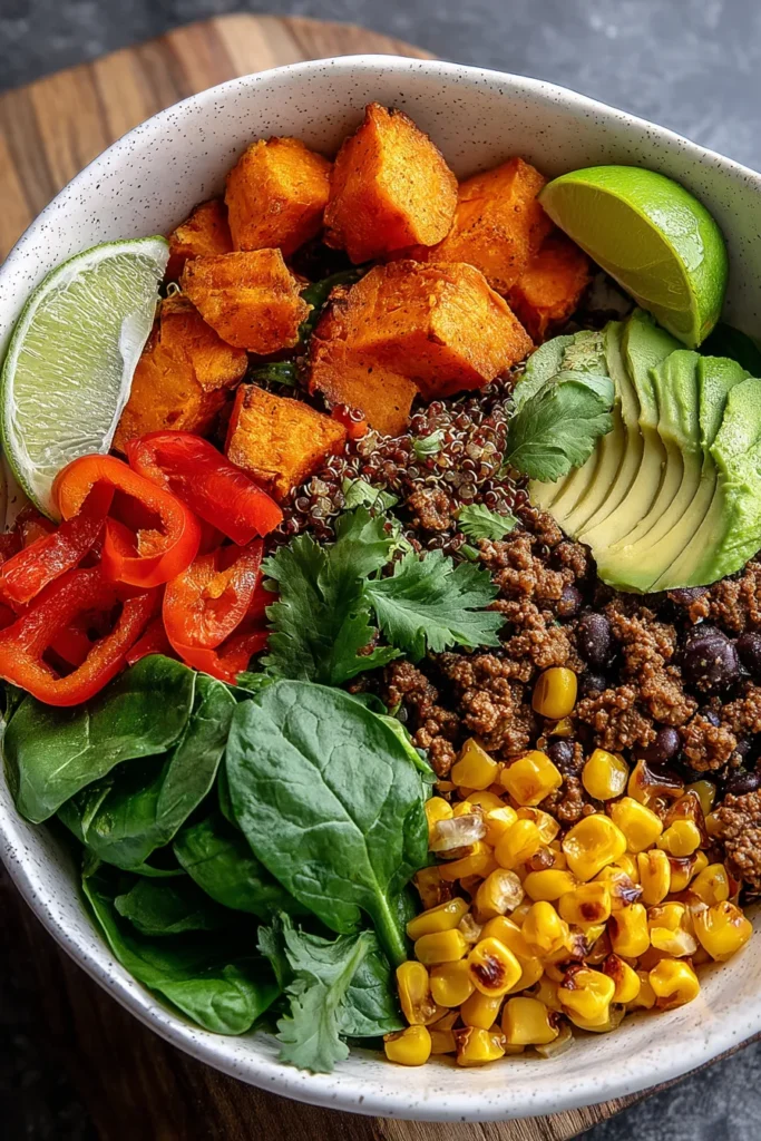 This vibrant bowl features spicy ground beef, roasted sweet potatoes, and wholesome quinoa, all topped with creamy avocado and zesty lime. Perfect for a nutritious meal!