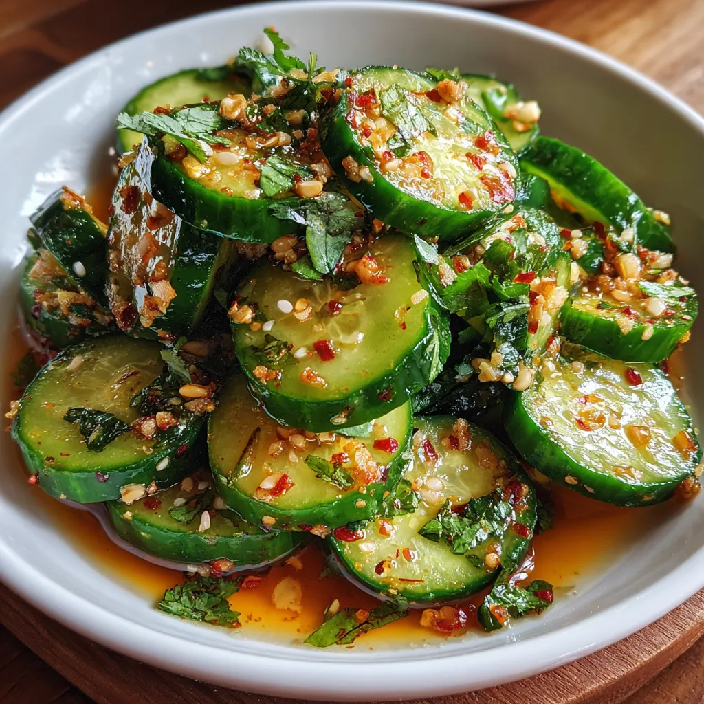 Tangy rice vinegar and soy sauce mingle with chili heat, coating crisp cucumber slices in a refreshing yet fiery embrace. Each bite crunches under toasty sesame seeds and bright cilantro for a truly addictive side.