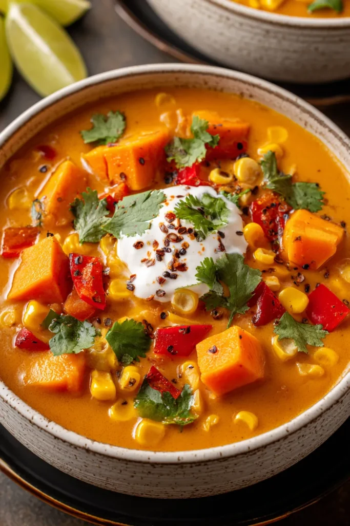 This creamy chowder blends sweet potatoes, corn, and bell peppers into a delightful bowl of warmth, spiced with smoked paprika and coconut milk for added richness.