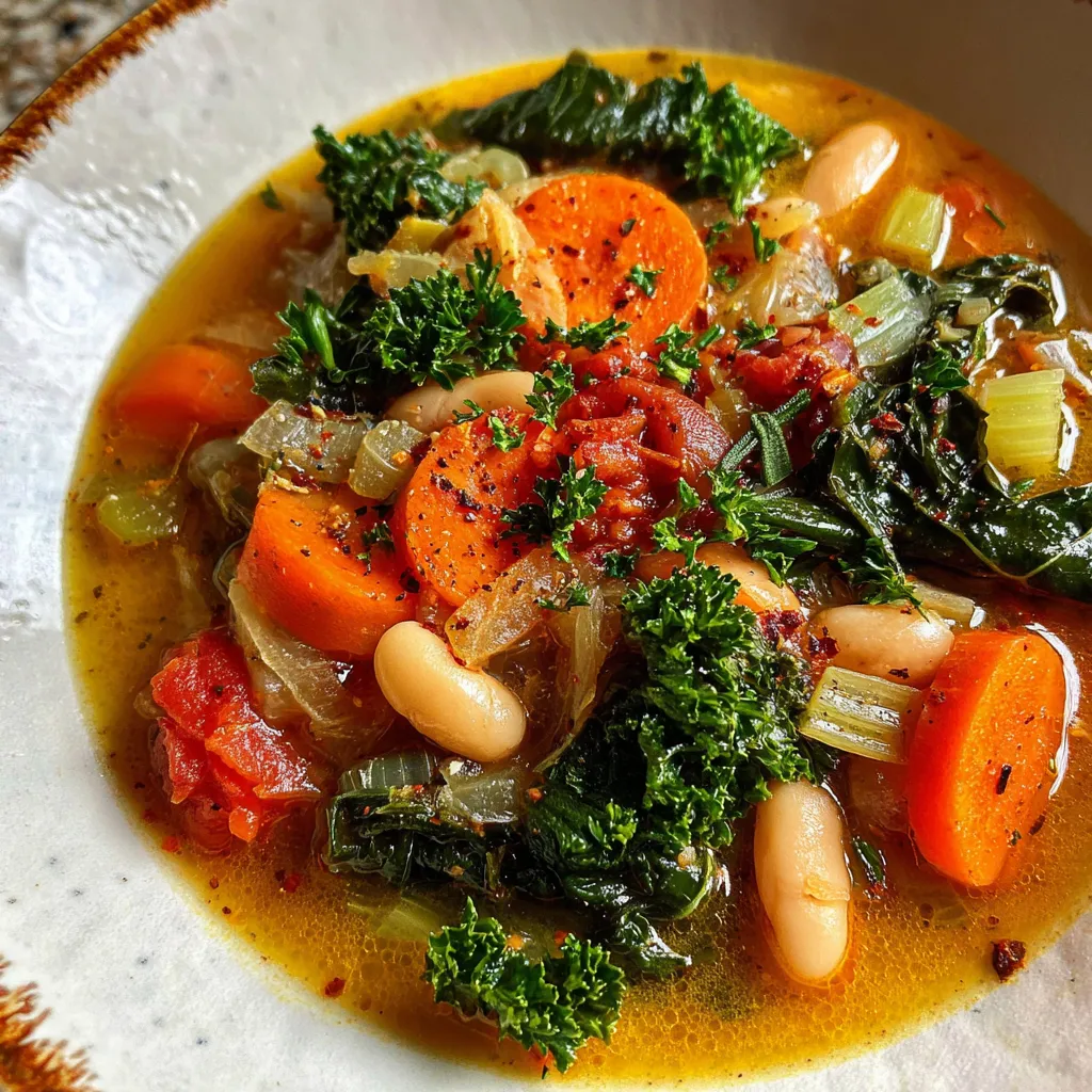 Rich aroma of garlic, rosemary, and thyme awakens the senses as tender beans, kale, and tomatoes simmer in olive oil-kissed broth, finished bright with lemon juice and parsley.